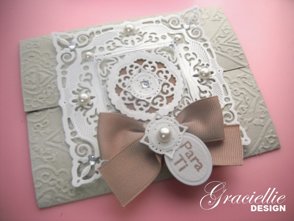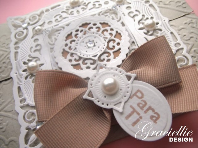 This is a gatefold card I decorated with Spellbinders Adorning Squares mixed up with the smallest die of the Delicate Doilies set. And of course I had to add some pearls and crystals (I confess I´m addicted to embelishments!). I happened to find a ribbon today that matches perfectly with my Brilliance Pigment Ink in Pearlescent Beige, which is more like sand or latte color.