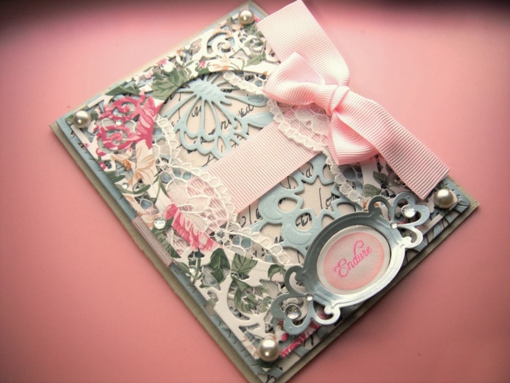 The third layer is ribbon and lace; the first one, picks up that cherry blossom pink that I love, and the second one brings that doily feeling to the card.