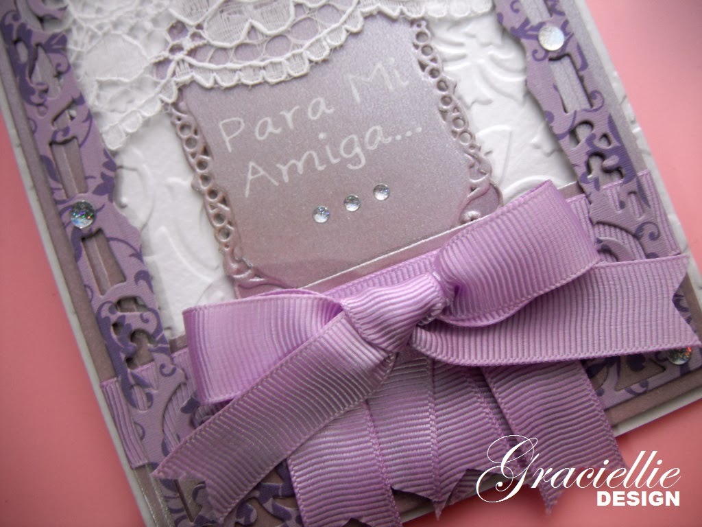 Elegí hacer la tarjeta color lila… ¡Ah que bello color! Disfruté mucho hacerla. Para comenzar, texturizé la base misma de la tarjeta. Le siguen una franja de encaje blanco que cubre la etiqueta del mensaje. Luego elaboré un marco de la exacta estructura que muestra el sketch. Una vez hecho eso, lo sobre enmarqué con lo que aparece como encaje de papel estampado. Dos características importantes del diseño propuesto para el reto son los banderines, que y también el adorno, que decidí fuera un moño lila combinando con los banderines de cinta. Uno que otro cristal y voilá…