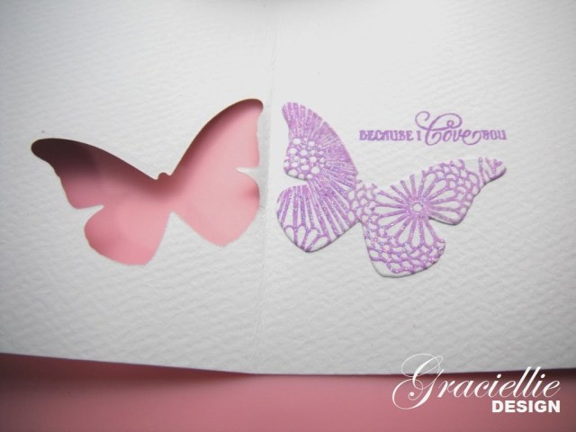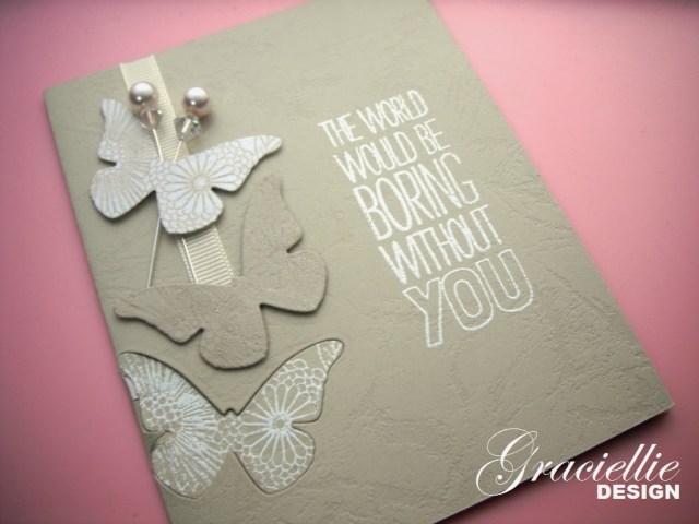 Anyways, it all started when I saw some of the new products from Technique Tuesday at the recent CHA. They released some dies that you could actually replicate with dies you already own and a bit of will (like the Cool Tab Card, Heart Card, etc). I thought I would start trying to replicate that effect with a few cards. They also carry coordinating stamps, another thing I thought I could try to replicate too. I ended up creating the cutest butterfly window card. The beauty of them, is that they only required one die, embossing powder, and ink. I finished them with some ribbon and my DIY pearl pins.