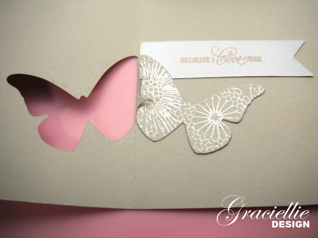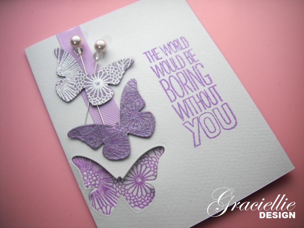 Anyways, it all started when I saw some of the new products from Technique Tuesday at the recent CHA. They released some dies that you could actually replicate with dies you already own and a bit of will (like the Cool Tab Card, Heart Card, etc). I thought I would start trying to replicate that effect with a few cards. They also carry coordinating stamps, another thing I thought I could try to replicate too. I ended up creating the cutest butterfly window card. The beauty of them, is that they only required one die, embossing powder, and ink. I finished them with some ribbon and my DIY pearl pins.