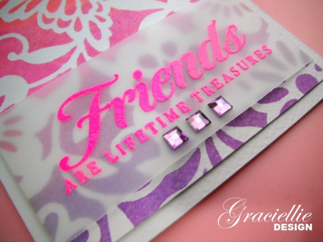 I stamped a sentiment on vellum and finished it with some lilac gems. Very simple but colorful and fun card, and a perfect friendship Valentine’s card.