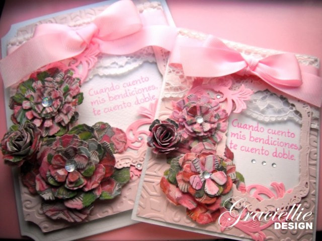 Hello everyone! I have another post for you today, a very brief one. I want to show you a remake of a card that has been a favorite both here and on my facebook page, the Double Blessing card. Someone asked me to make it extra large for his mom’s birthday, and so I did. It is quite elegant and for what I see it kept it’s charm. The sentiments are in spanish and translated it says: “When I count my blessings, I double count you” and “Happy Birthday” in the inside of the card.