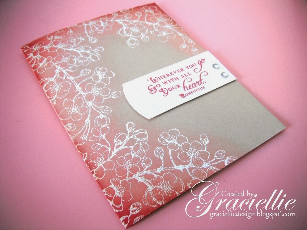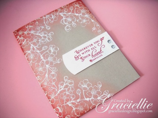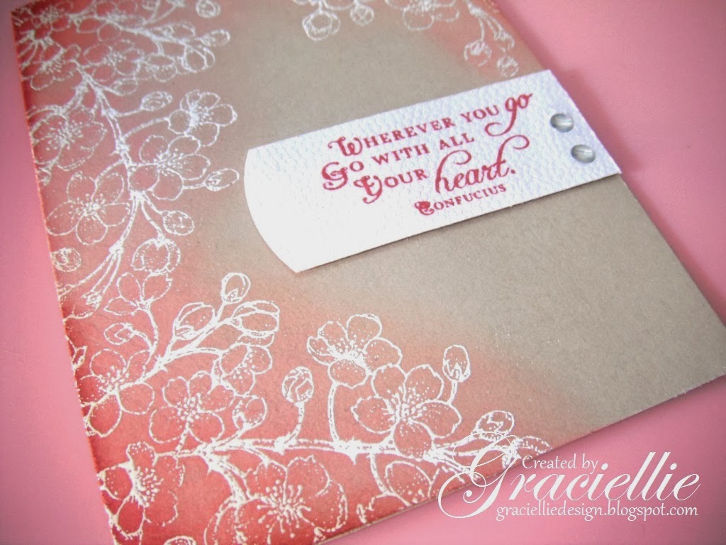 I applied a bit of memento ink in Rhubarb Stalk on the corners to deepen the transition and to coordinate with the sentiment. It ended more like a darker shade of pink, it blended well with the distress inks I used. The white label was handmade and I curved one of the sides using an EK Success border punch.