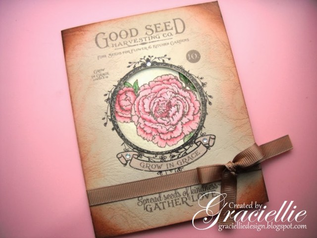 I wanted to keep it simple, the card itself is the seed packet! I did create a window with a circle cutter, so that the Peony could stand out. And that is also why I stamped the flowers on white card stock. I combined to different coloring techniques, but because of the way I did it you can’t tell immediately that the leaves are actually water colored while the flowers were colored with markers. I distressed the card with pink and brown, that way the tones of color coordinate with the flowers. I love the vintage look of it. To finish it I added some crystals and brown ribbon. It sure feels antique and for some reason fresh at the same time. Must be that wonderful pink Peony… 😀