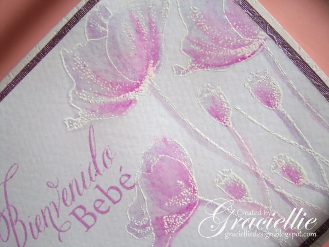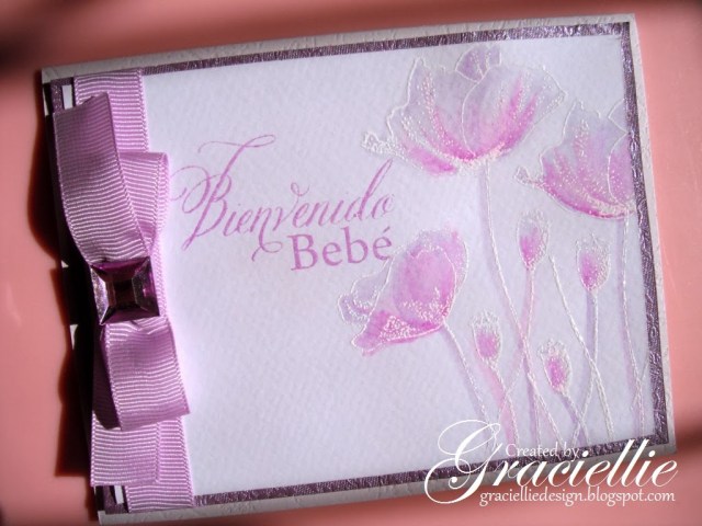 I made this card for my doctor. She is pregnant with a baby girl, and I just couldn’t resist using lavender. The Spanish sentiment stamp is from Stampendous and translated it says ” Welcome Baby”. The beautiful Penny Black poppies were embossed in white and water colored with Faber Castell pencils, using the technique I explain here.