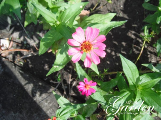 I have had all kinds of Zinnias, but of course my favorite ones are the double Zinnias. They grow in every kind and color naturally on the front of my house and they continue to spread by themselves around the corner. They have died and regrown again naturally, something that makes me think of these flowers as very noble plants. At this exact moment I possibly have more single and semi-double Zinnias. And, I have them mostly in pink, orange and red right now, but I’ve had them also in yellow and white before. Good thing there is an infinite amount of buds ready to bloom…