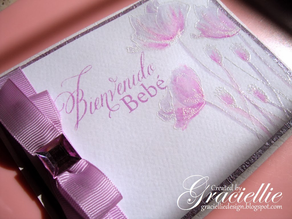 I made this card for my doctor. She is pregnant with a baby girl, and I just couldn’t resist using lavender. The Spanish sentiment stamp is from Stampendous and translated it says ” Welcome Baby”. The beautiful Penny Black poppies were embossed in white and water colored with Faber Castell pencils, using the technique I explain here.