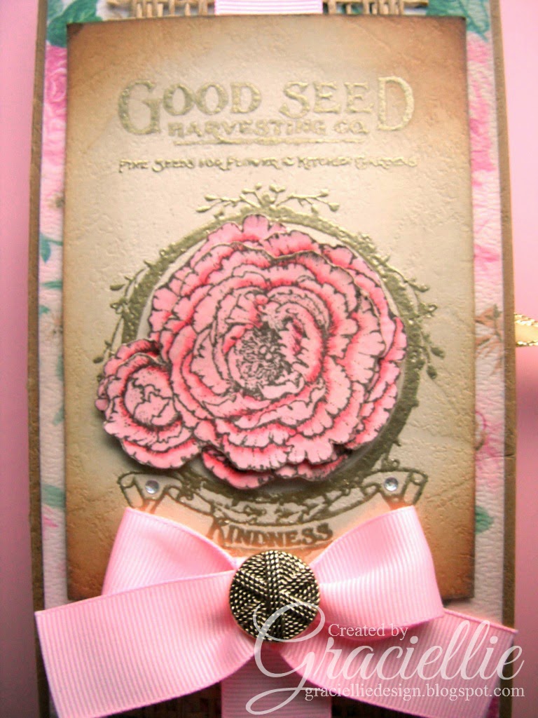 The box was covered with a beautiful floral paper inside and out. I embellished it with gross grain and burlap ribbon, a vintage button, and let the stamped images be the focal point. For the main decoration of the box, I created a vintage seed packet, all embossed in gold. The Peony was stamped and colored twice, and one of those images was cut in pieces that I then layered around the original stamped flower, to make it look larger and fuller.