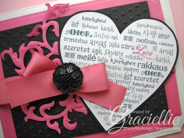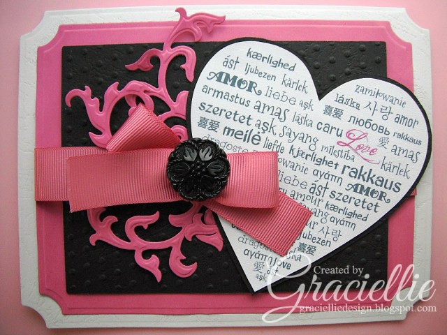 This is a 5⅜” x 7″ label shaped card I layered with a smaller coordinating hot pink label and a polka dot embossed layer in black. The image is the focus of the card and it was carefully hand cut and adhered to a black heart frame. To finish the design I added some paper flourishes, ribbon and an embellished bow.