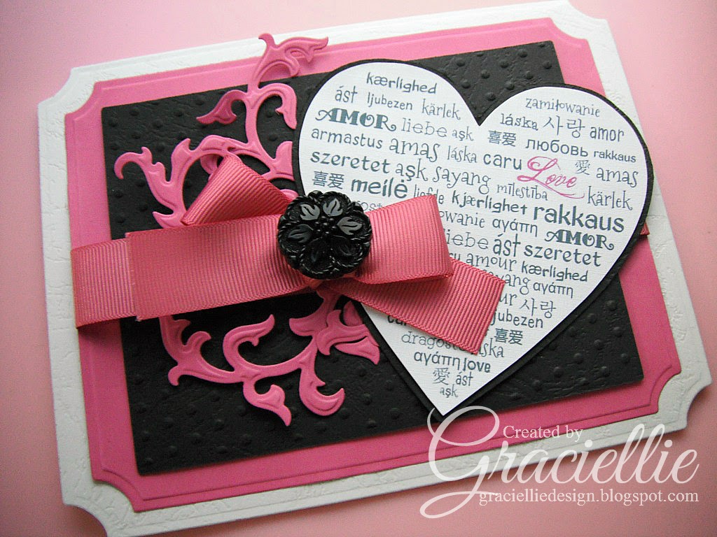 This is a 5⅜” x 7″ label shaped card I layered with a smaller coordinating hot pink label and a polka dot embossed layer in black. The image is the focus of the card and it was carefully hand cut and adhered to a black heart frame. To finish the design I added some paper flourishes, ribbon and an embellished bow.