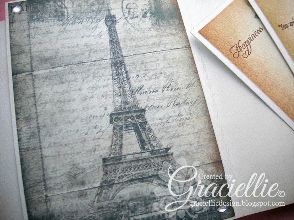 Once you open the card, it’s left side is decorated with a grungy image of the Eiffel Tower. It comes as it is so there’s nothing to do but cut it. I just added some crystals to it’s corners to frame the image.