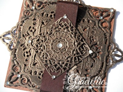 This is a 4″x4″ card, layered with two large adorning squares that were later wrapped with a piece of brown ribbon. On top I added a small square, embellished with two circular dies that together form a medallion. The elegance of this card consists of die cuts, they add much texture and interest to the design.