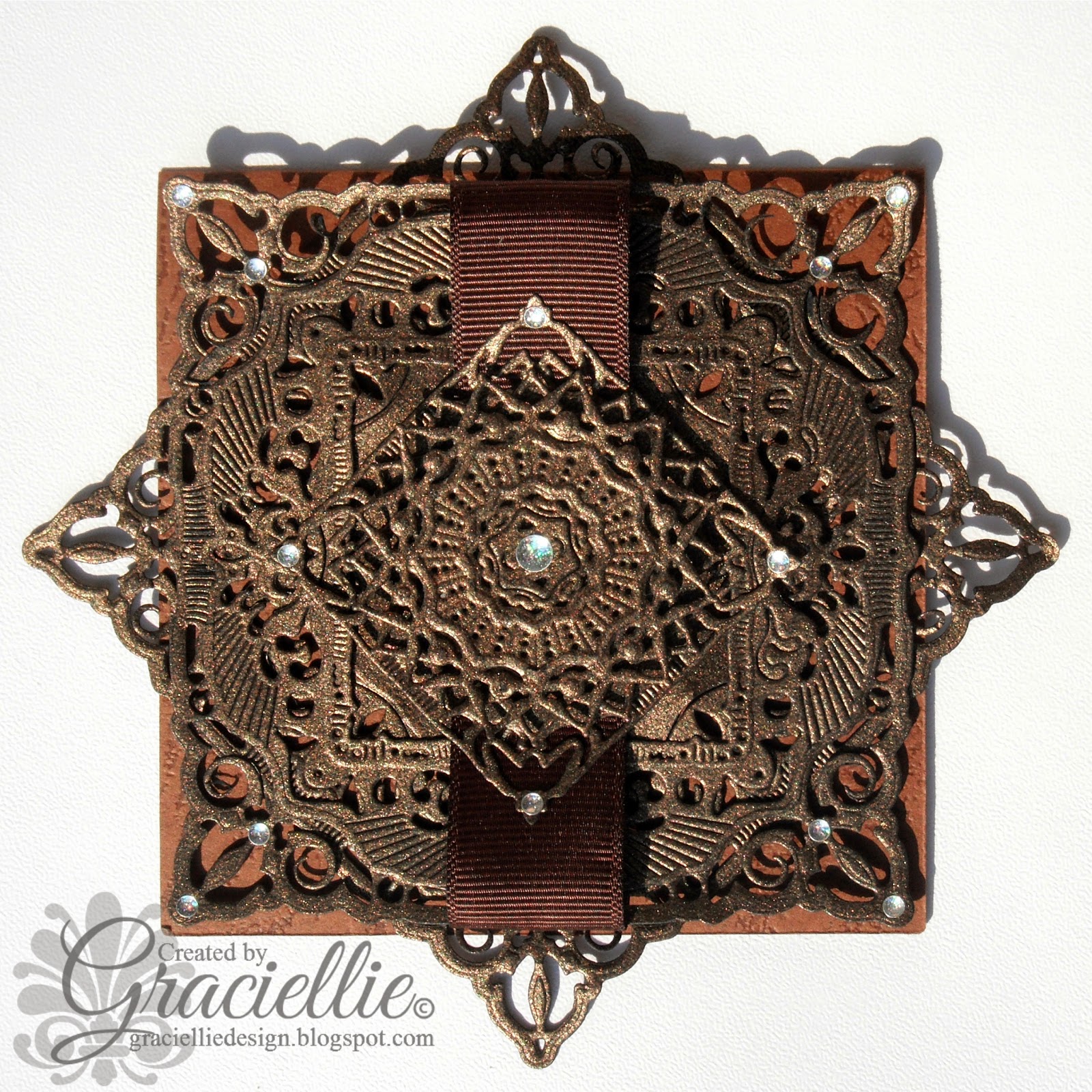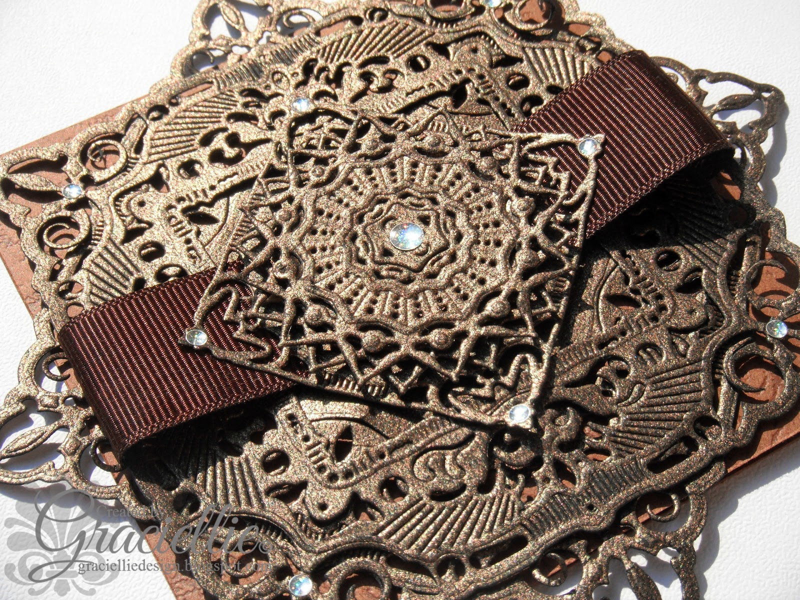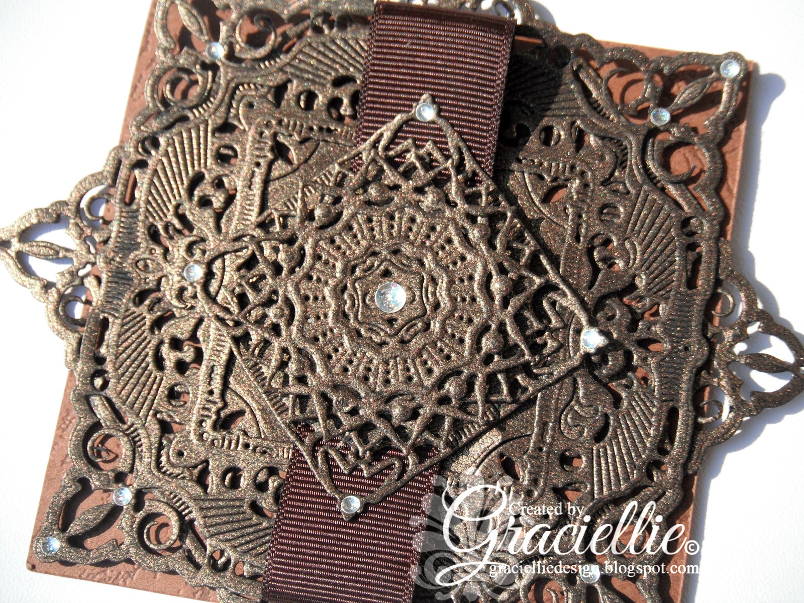 This is a 4″x4″ card, layered with two large adorning squares that were later wrapped with a piece of brown ribbon. On top I added a small square, embellished with two circular dies that together form a medallion. The elegance of this card consists of die cuts, they add much texture and interest to the design.