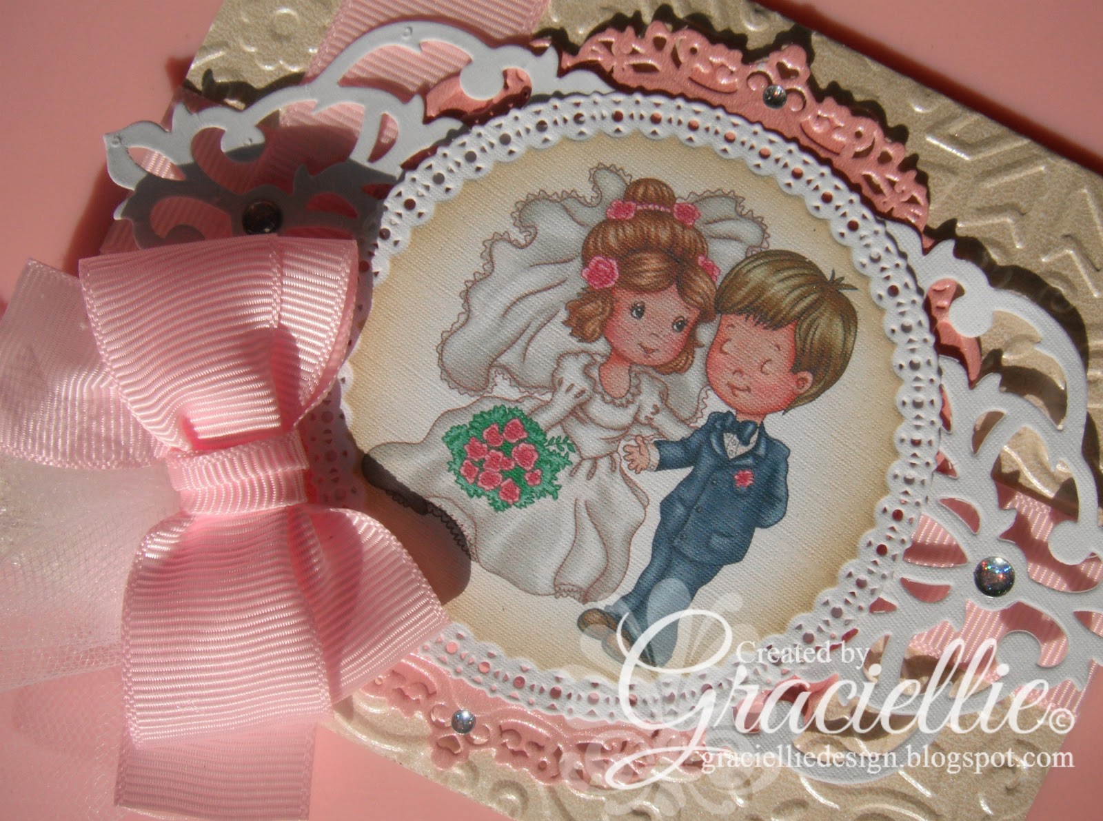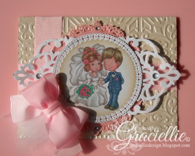 The card base was a left over of some actual CAS wedding invitations I was commended to make (didn’t take pictures of those, no time). The image is pre-colored so it was a matter of layering die cuts and adding embellishments to finish the card. I crossed two pieces of ribbon and added a double bow and some tule to give it a delicate look.