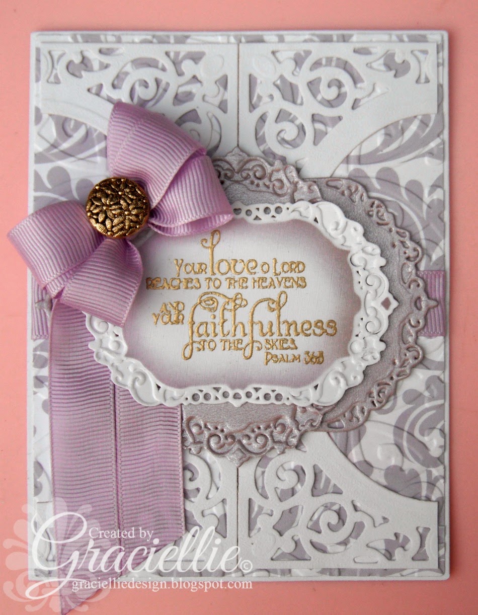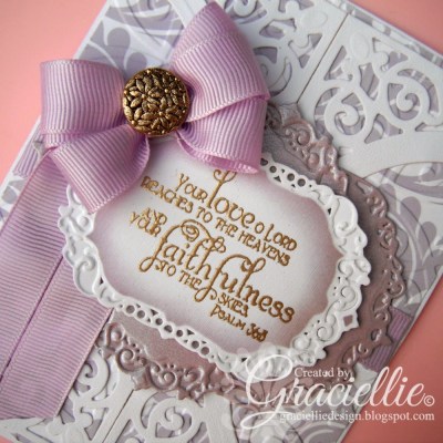 2. Then I die cut the next smaller label twice, once in lilac and once in White Pearl Linen. I adhered the smaller lilac label vertically and then added the white label horizontally on top of it. The white label was stenciled and sponged with Memento ink in Lulu Lavender. Lastly, I stamped and heat embossed a sentiment from Our Daily Bread Designs in Gold Detail embossing powder.