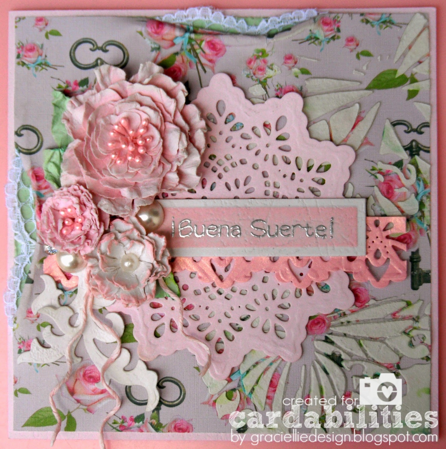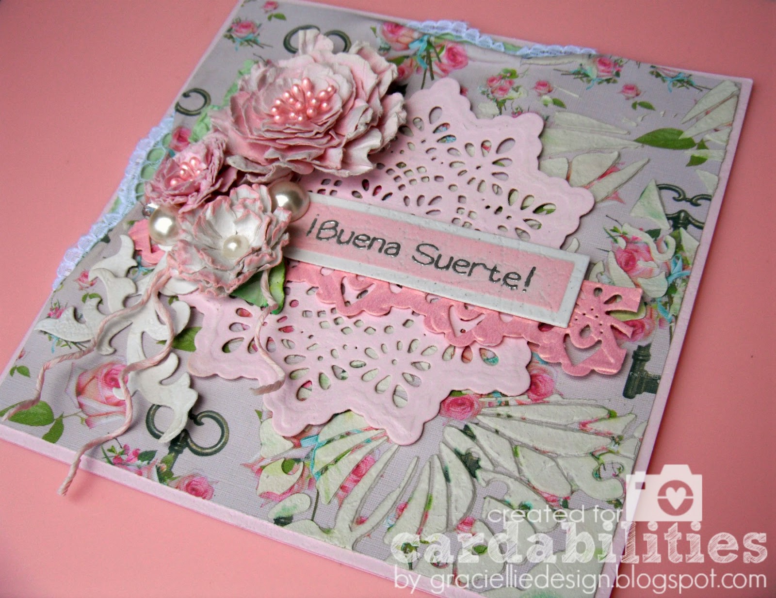 This is a shabby chic card with lots of layers. The main patterned layer was wet and distressed letting show some lace on the background. Also I used some beautiful butterfly masks to stencil, using homemade paste. After that was done, I added the central layers and handmade flowers. The “Good Luck” Spanish sentiment was heat embossed in silver.