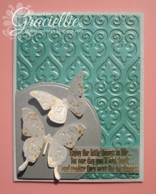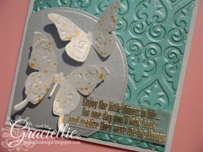from Candido Incandescent Metallic cardstock. I then splattered some Inka-Gold (in yellow gold) water to the butterflies by tapping a brush. And finally I heat embossed sentiment from Gina K. Designs’ Little things stamp set on Vellum. All was adhered to a Leather Textured cardstock card base.This will be my last project for the day but please keep vising Hiding in my Craft Room and my teammates’ blogs to learn about the remainding challenges and see all what has been created for your inspiration.