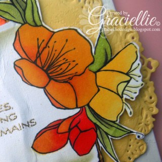 I colored this digi with Spectrum Noir markers from various sets (Yellows, Reds, Greens, Browns). I used the out of the box technique, one that I enjoy to use with this kind of floral images. I die cut the labels with Spellbinders Classic Labels Four and Spellbinders Gold Labels Four. The white label was stenciled with Distress Ink in Peeled Paint and heat embossed with a sentiment from Flourishes’ Flowers for Jan stamp set in gold. I added a central panel layering leather textured cardstock in orange (also dried embossed) over patterned paper from Shery K. Designs. It was all adhered to a leather textured cardstock card base in white. Amazingly almost all was made from scraps!