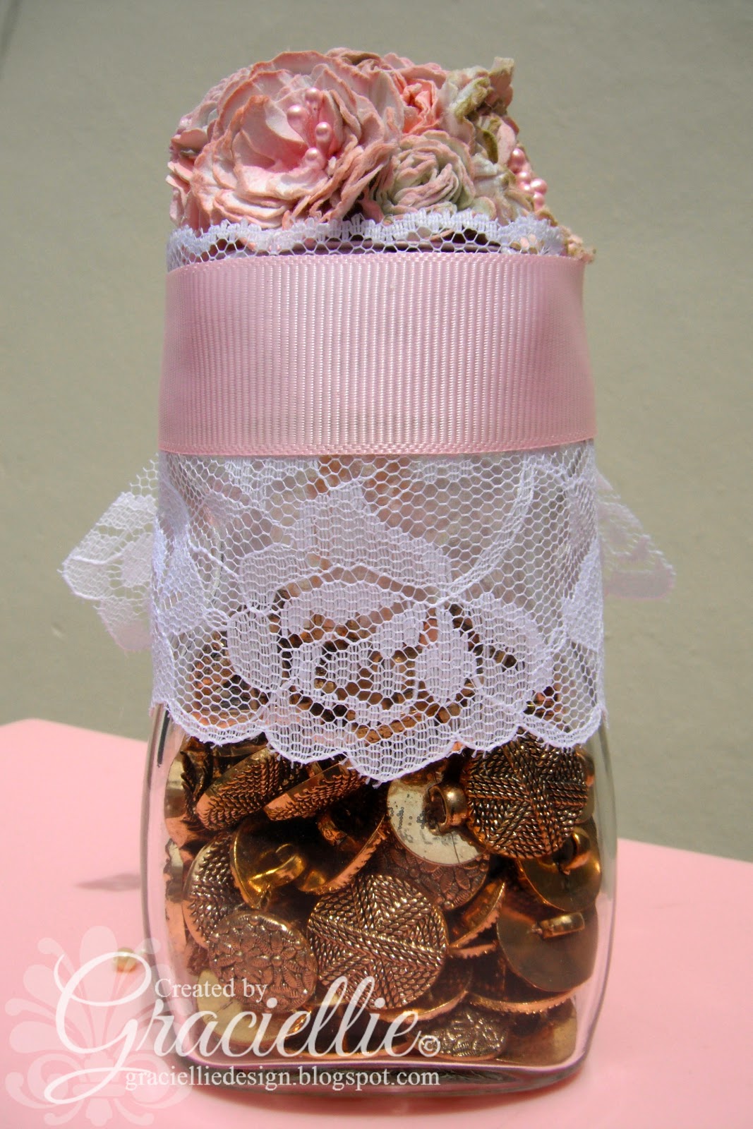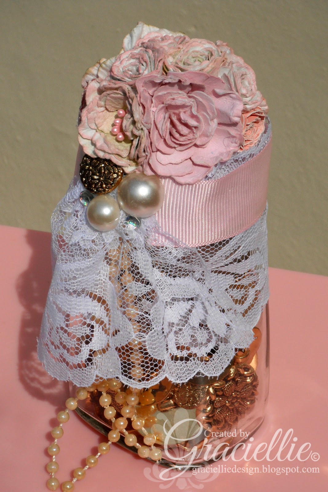 Gracielle, I'm a huge fan of your beautiful shabby chic style ,and this altered jar is a prime example of why I love your work. Those flowers are absolutely stunning! So many beautiful details…you are amazing! Thanks so much for being a guest designer for Craft Hoarders Anonymous!