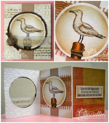 I went for warm colors and a very classic design. I used Gina K. Designs’ Little Things Duo stamp set, that I recently got from the store. I colored the image with Spectrum Noir markers from various sets (Browns, Pale Hues, Essentials). To create that contour shading on the bird, I simply used the blender to remove all the browns I had colored it with first. I did use the softer tones of browns mostly. Also I sponged both the image and the card itself with Distress Ink in Old Paper.