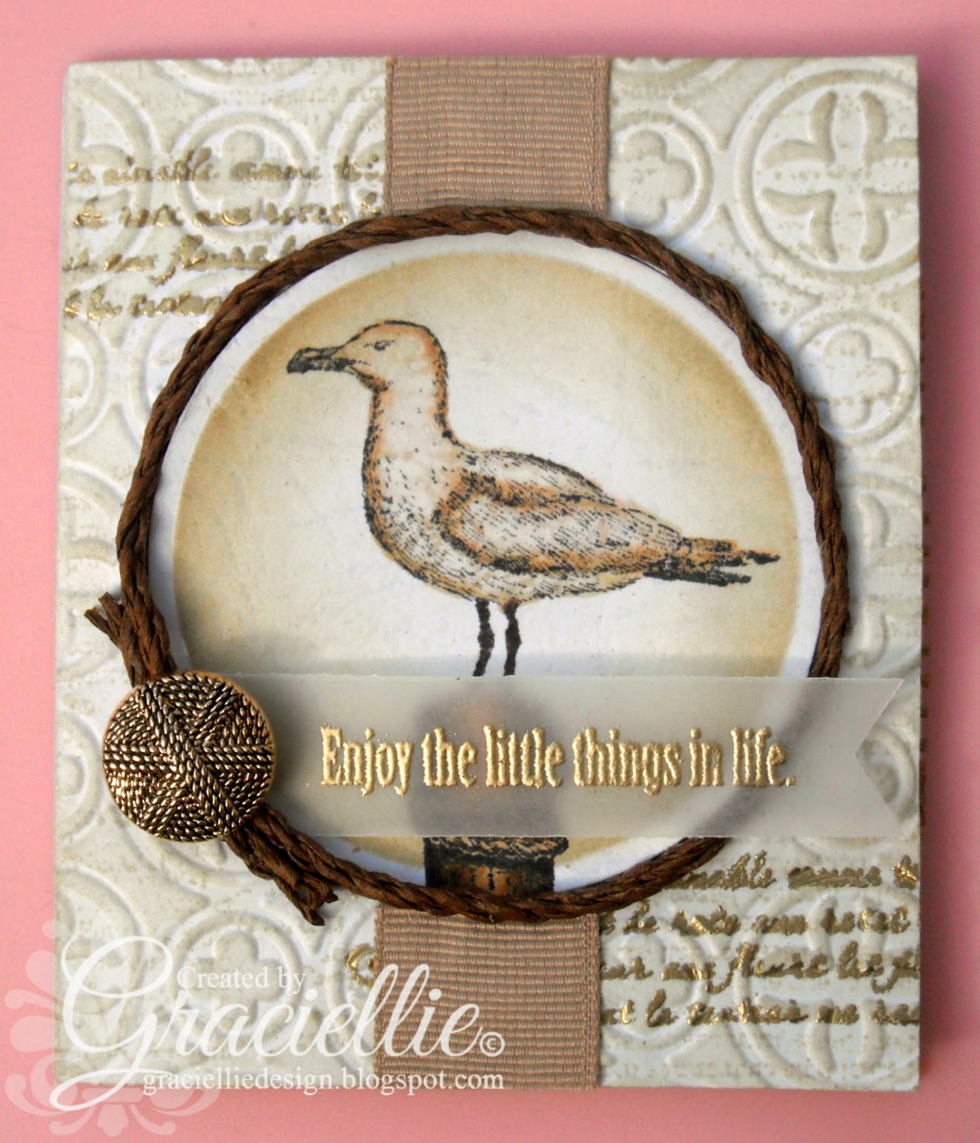 I went for warm colors and a very classic design. I used Gina K. Designs’ Little Things Duo stamp set, that I recently got from the store. I colored the image with Spectrum Noir markers from various sets (Browns, Pale Hues, Essentials). To create that contour shading on the bird, I simply used the blender to remove all the browns I had colored it with first. I did use the softer tones of browns mostly. Also I sponged both the image and the card itself with Distress Ink in Old Paper.