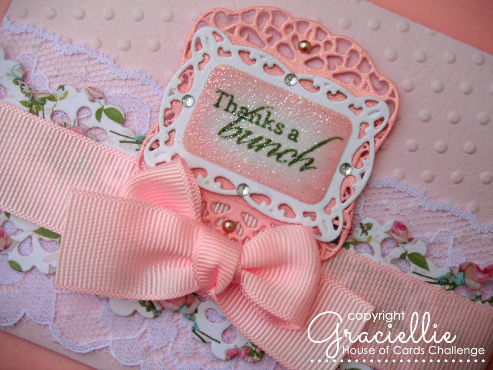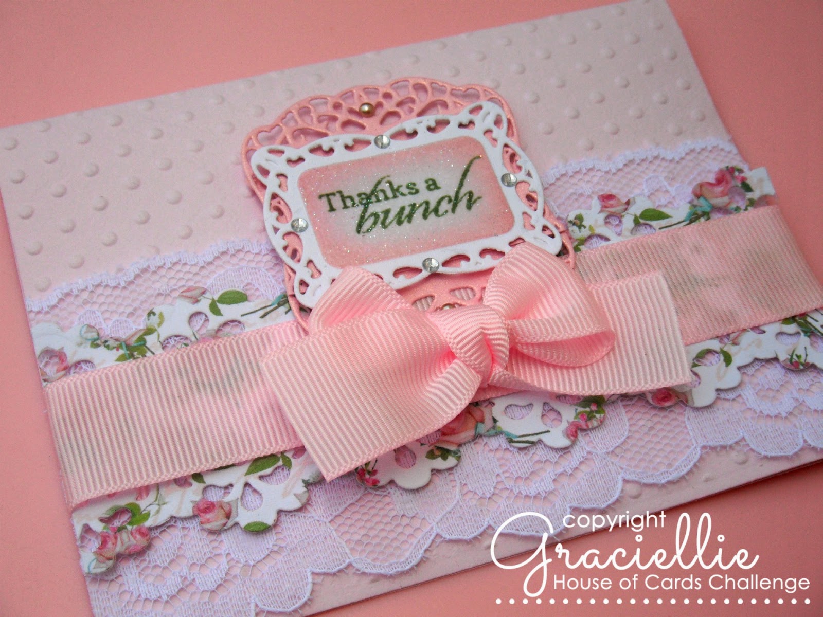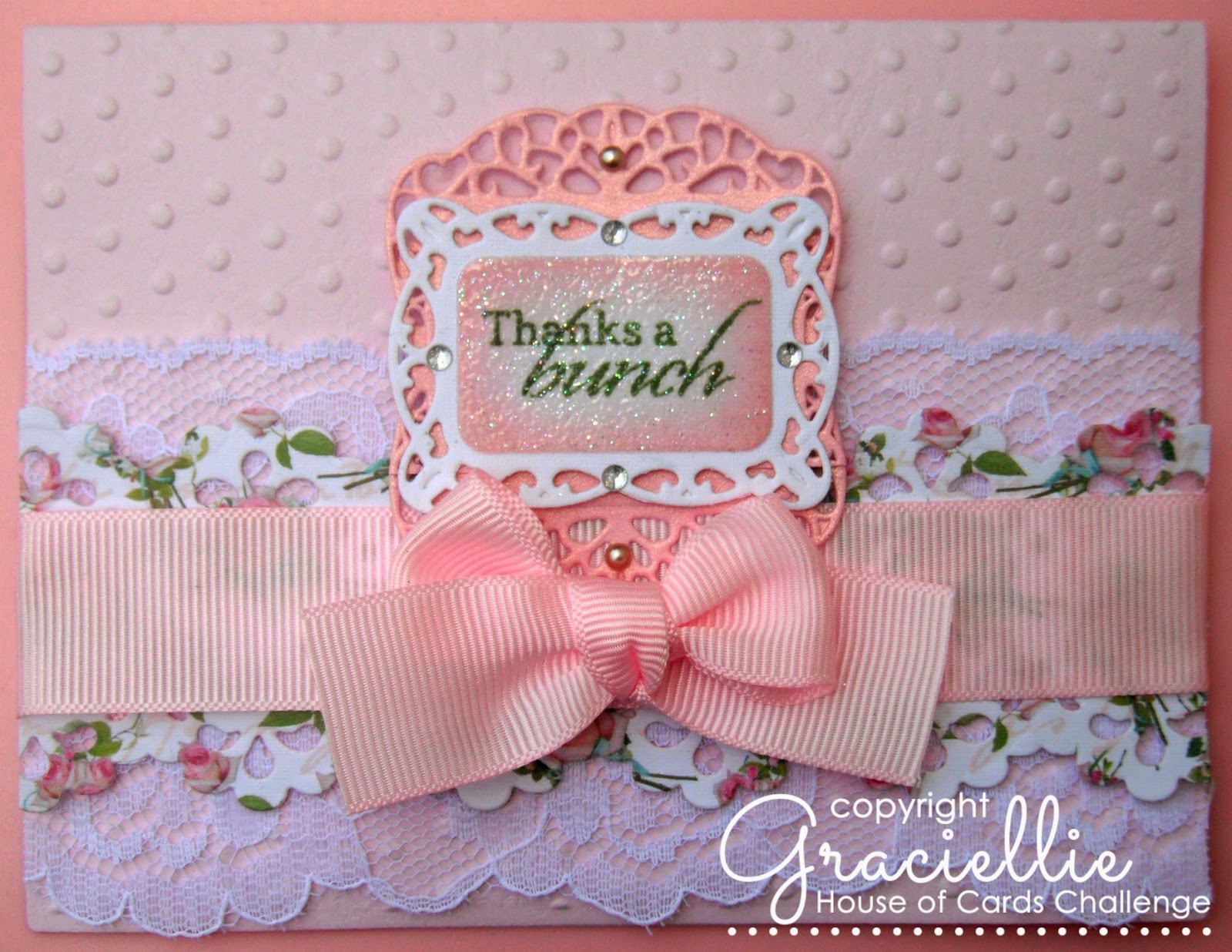 When I saw this sketch all I could imagine was ribbon and lace, with lace die cut borders. And so this is what I came up with: