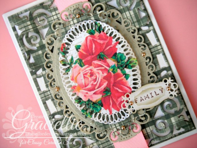 I layered the four corners right on top of the frame’s corners to create a subtle tridimensional effect, subtle because both were cut from the same paper. I added a piece of pink ribbon vertically right on the center. Then I mounted the large oval, followed by the small oval which was decorated on its top and bottom ends with the patterned tag label. The tag label was actually cut in half, and I adhered the pieces to the back of the small oval, showing only the filigree ends.