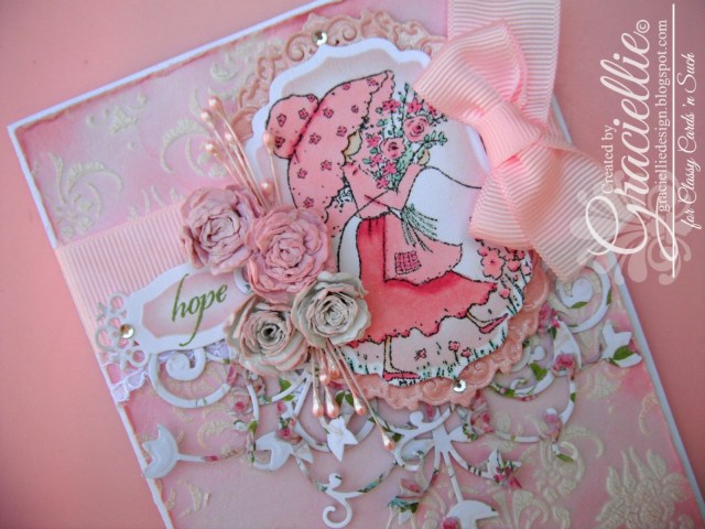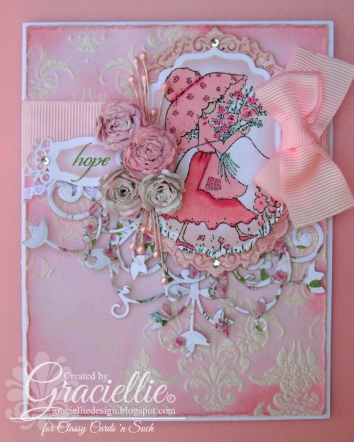 I adhered the three altered flourishes behind the framed image and mounted it all on top of the ribbon and lace, to the right. I made some small roses using Bitty Blossoms medium die. I added those to the left side of the framed image together with some pink pearl stamens. I also attached a little tag underneath the roses, die cut with Fancy Label Tags One, on which I stamped the word hope, from Flourishes Zinnia set, using with Memento ink in Bamboo Leaves. I stenciled the label tag with Distress ink in Spun Sugar too. I finished the design with one pretty bow on the right side of the image and some Baby Rhinestones – Silver. And finally I attached the very embellished mixed media layer to a white card base.