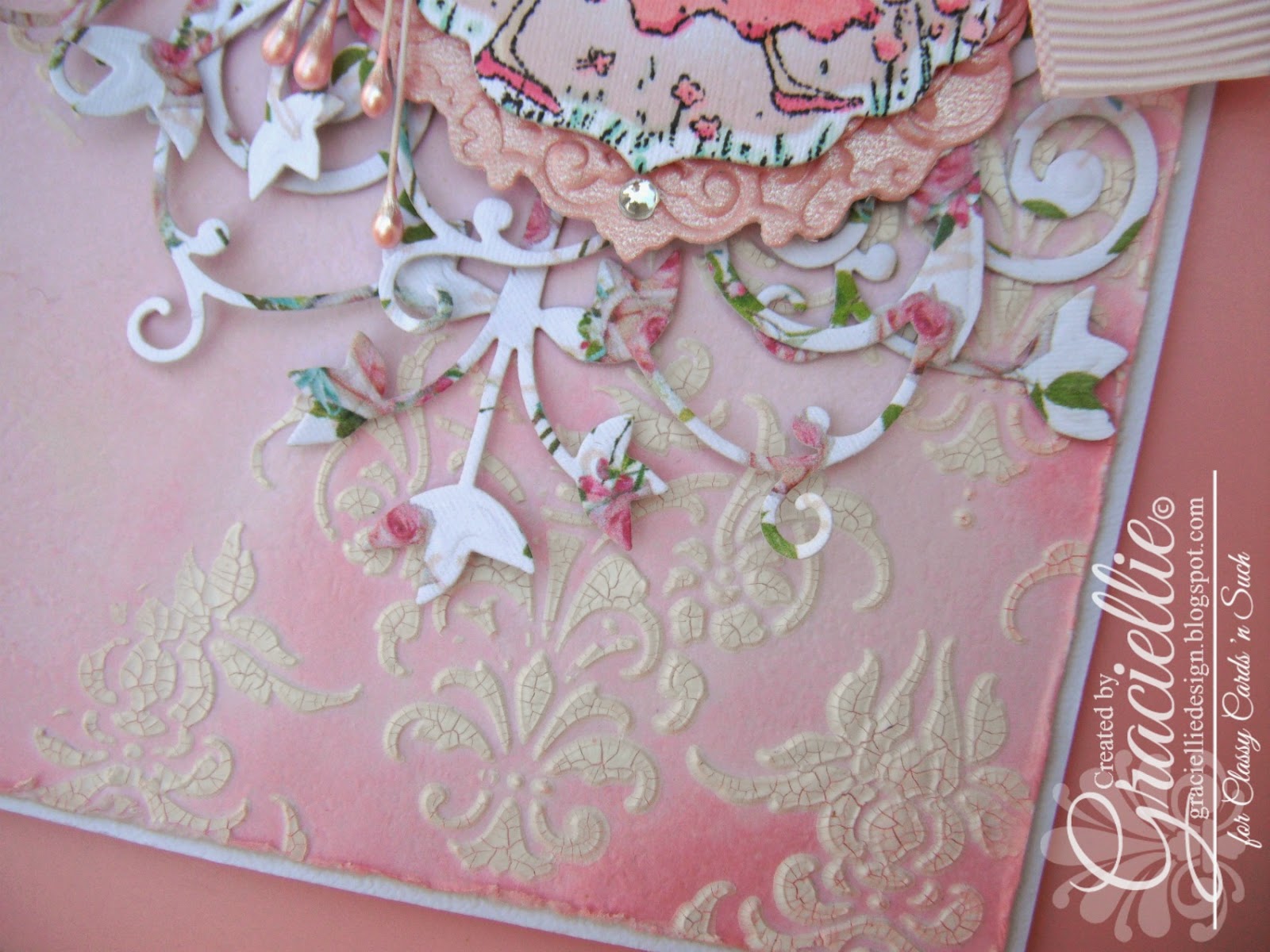 My card for today is adorably pink. It’s a mixed media card. The background was die cut with A2 Matting Basics A from soft pink cardstock. I then stenciled it with Crackle Embossing Paste, using the Large Damask stencil, both from Dreamweaver. Once the paste dried, I applied two tones of pink Distress inks (Spun Sugar and Worn Lipstick) with a Mini Ink Blending Tool irregularly and also sprayed some water on it. Next I distressed the edges of the layer manually.