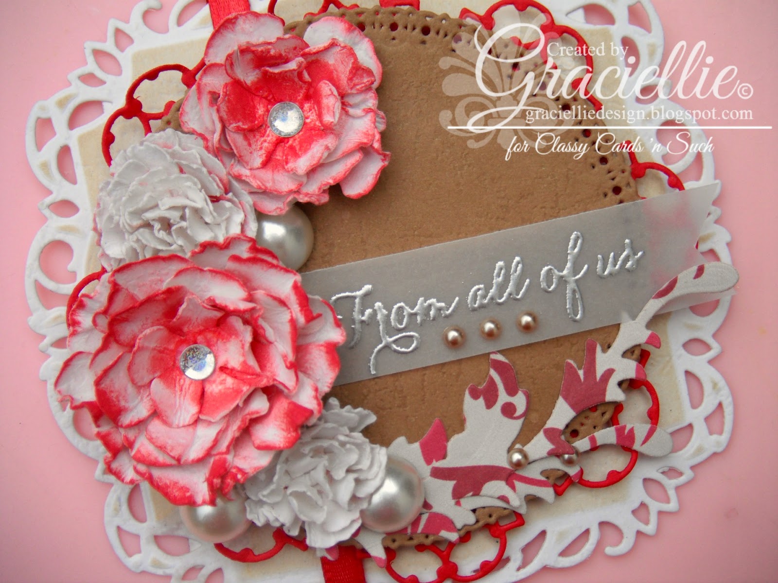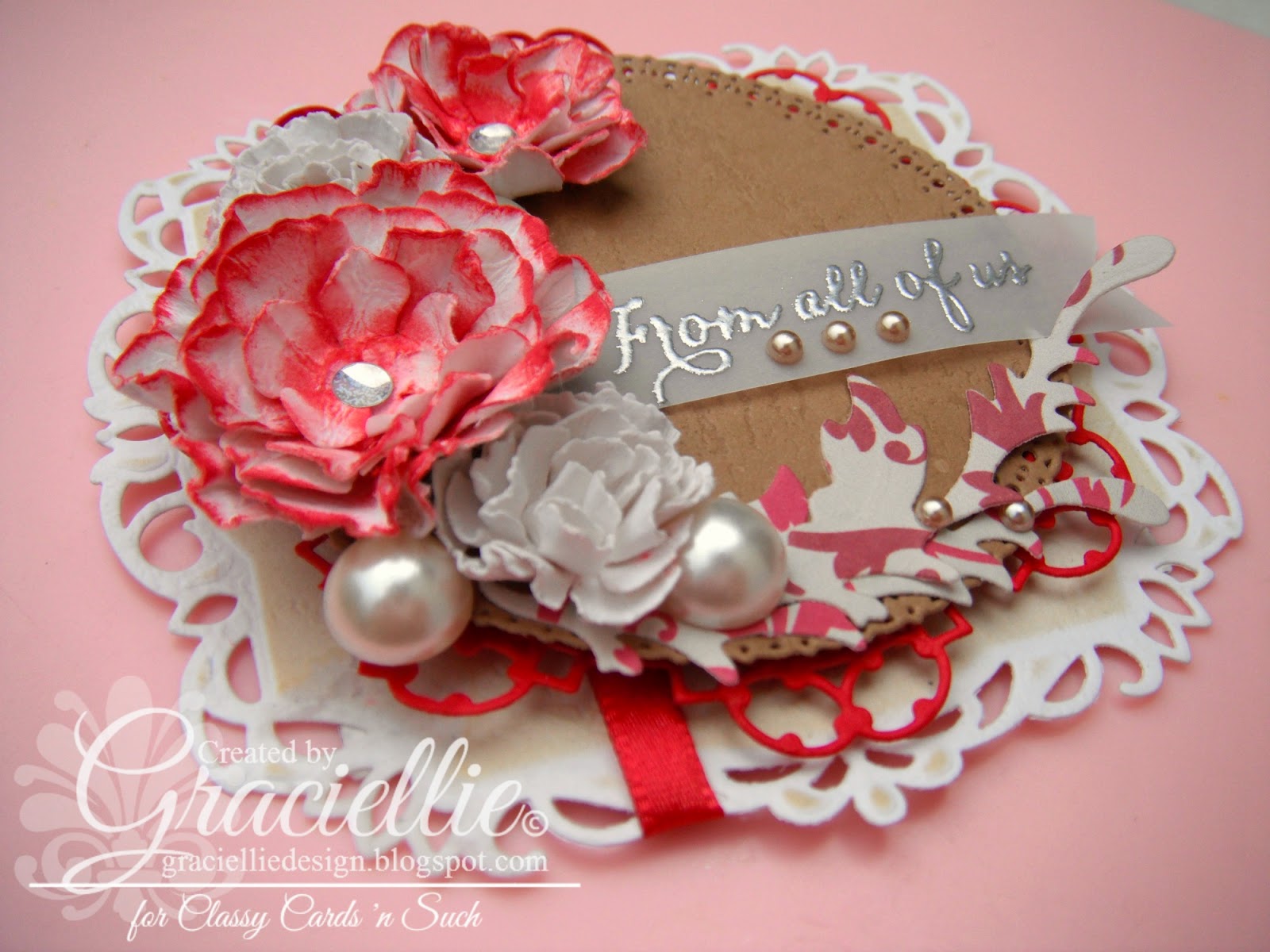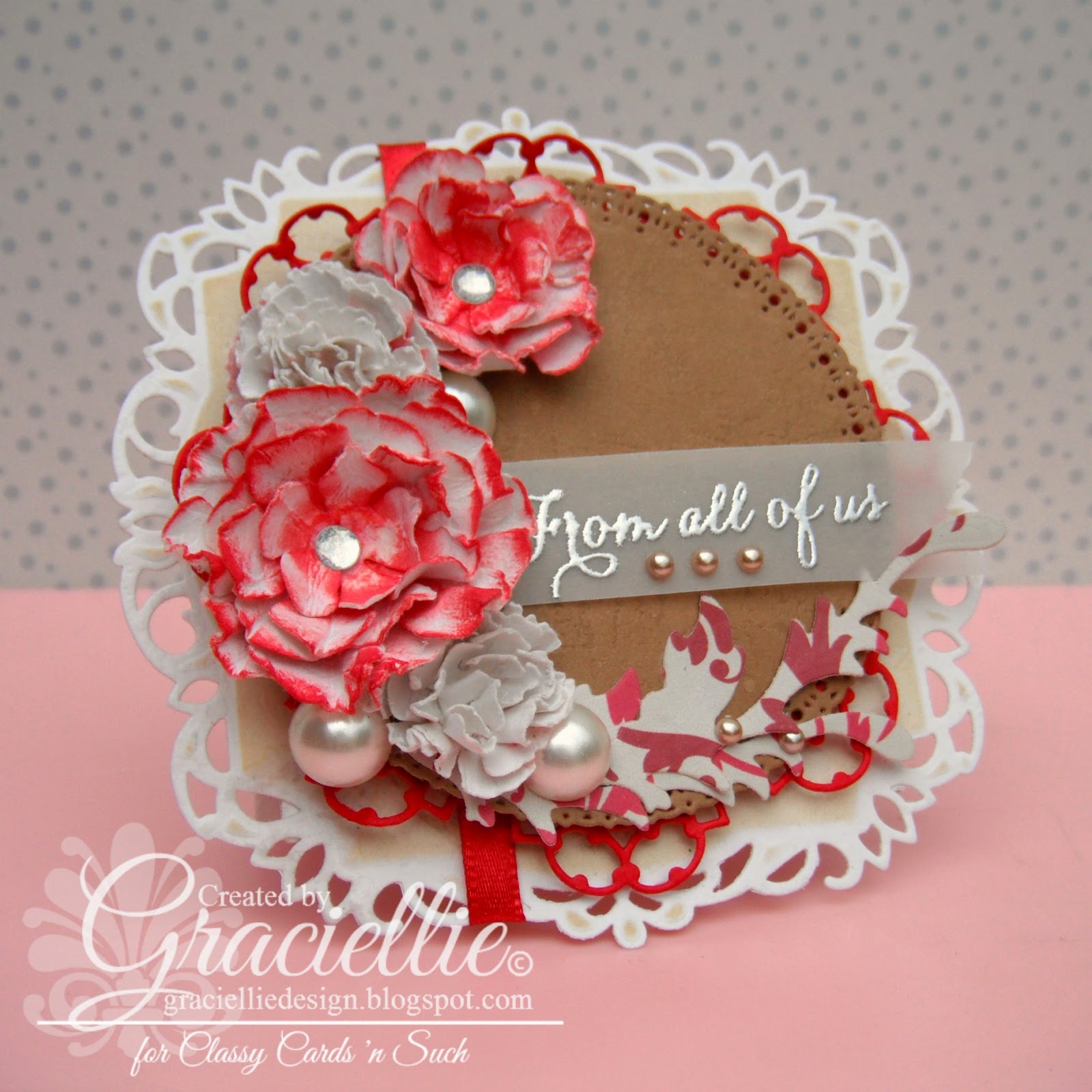 I used Spellbinders dies to make my card. I made some white and red handmade flowers and created a nice Christmas bouquet. I used some pretty label die cuts to create a nice frame for the flowers!
