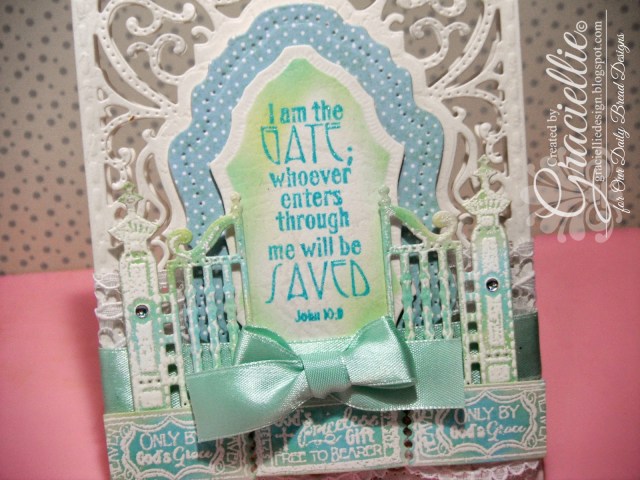 I added a piece aquamarine ribbon on the bottom of the card and mounted the three stamped and die cut tickets below it, creating a border. Then I also mounted the gate die cut to frame the main sentiment label. To finish the design I added a pretty bow and a couple of crystal stickers.