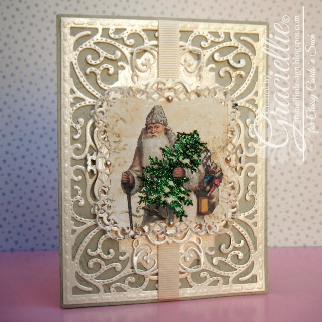 I started off by printing a vintage Santa image on Pearl White Linen cardstock. Then I added glitter glue to make the Christmas tree image stand out. I then die cut the image with Spellbinders Fancy Label Tags Two. I mounted the image on another label die cut with Spellbinders Decorative Labels Thirty-Four.
