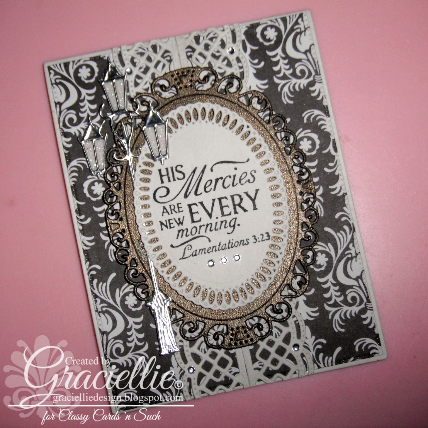 This week at Classy Cards ‘n Such we have a challenge that we’d love you to join: Time For A “New Year” – Use something new you just received and add some glitter and/or bling. I have been blessed recently with many new goodies, so I used some of them to make my card for today, and I also added some sparkle for the challenge!