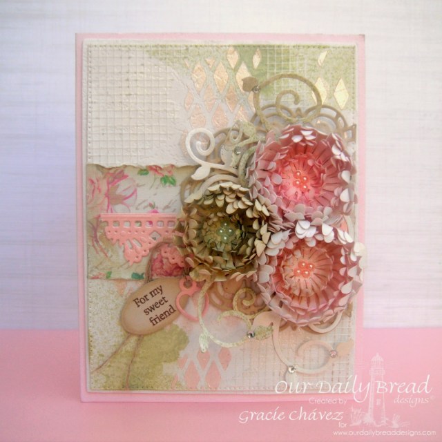I arranged a pretty bouquet with the finished flowers. I die cut a doily using ODBD’s Doily as a base to attach the flowers and different leaves I die cut with ODBD’s Fancy Foliage. I adhered the doily to the right of the card, cutting it partially to remove the piece remainding outside of the layer.