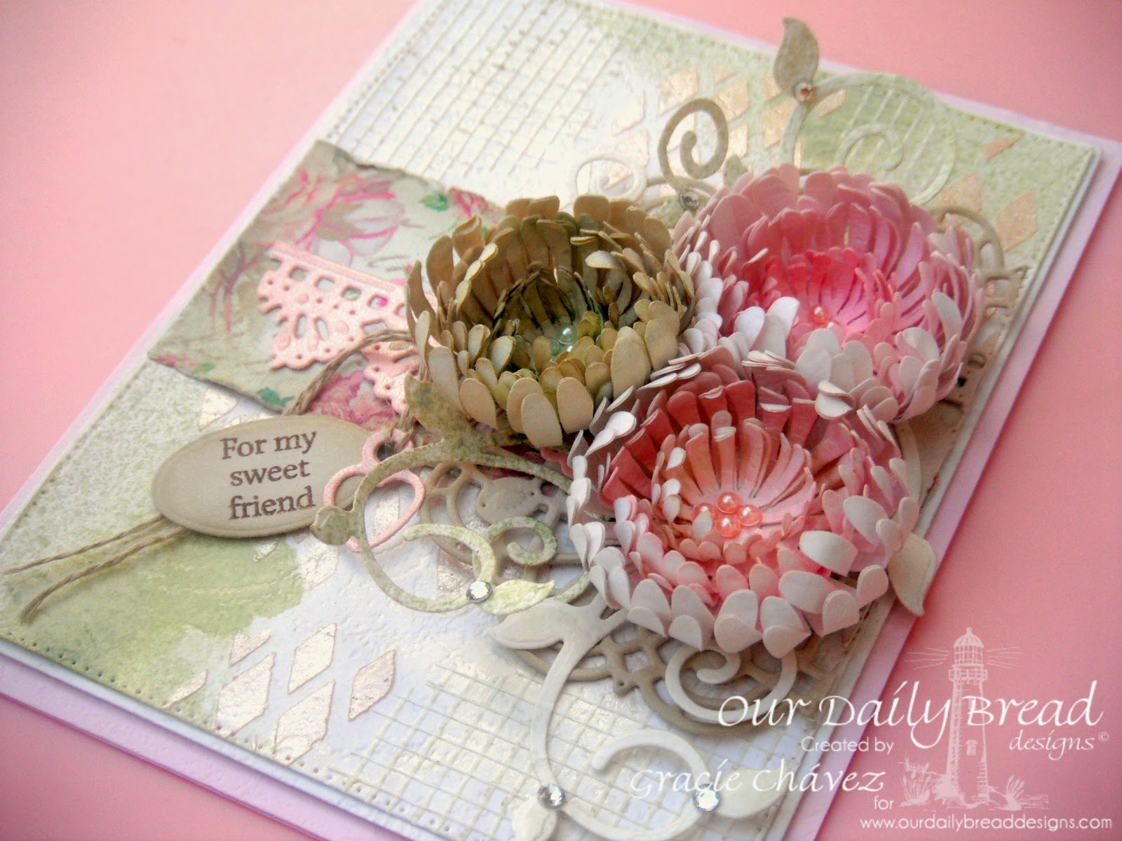 (Ink sprays, linen thread, mixed media & die cuts, embossing, flowers & bling -pearls-)