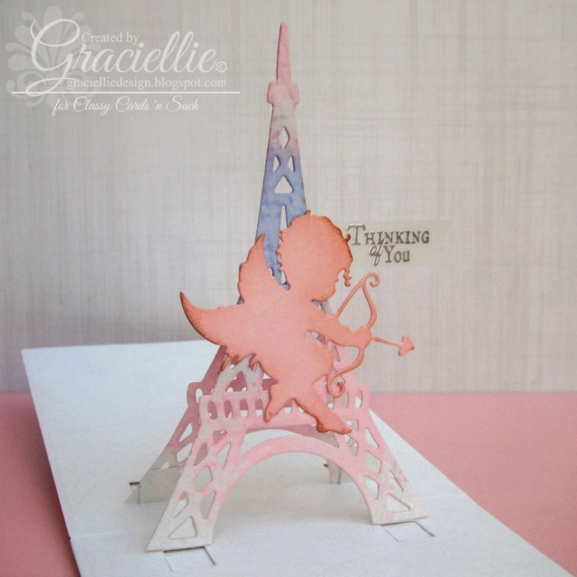 When you open this pretty card you are welcomed by a 3D, pop-up Eiffel Tower! I actually cut four flaps on each side of the card with an exacto knife to adhere the towers. I added another cupid and a Thinking of you sentiment from my stamp set Parisian Postcard to the tower to finish the design!
