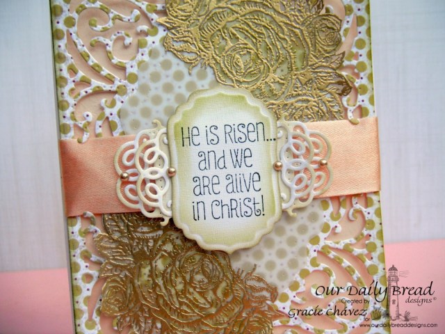 Gracie, what a beautiful card with such gorgeous embossing…adds so much richness! I love this paper, and I love the embossed roses. All makes this special sentiment so precious! He is risen indeed! Hugs!