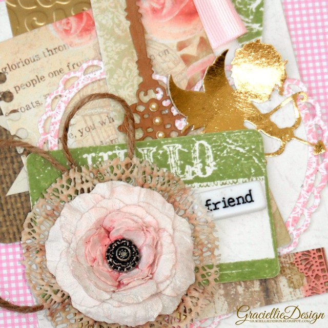 One of my favorite gold products lately is foil. If you follow me you might have noticed it (lol). I decided to go for a vintage / shabby chic free style collage card. It is certainly a more modern take on shabby chic, but I do love all the elements together. The little cupid was die cut from Deco Foil double sided foam adhesive to which you just have to add the foil directly, no heat required (view the tutorial here). There’s another hint of gold hidden behind the tags, banners and other elements, a strip of embossed gold paper. Hope you find this idea fun and useful!