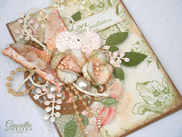 The classic background that resulted from duplicating the lace motif and editing it’s color guided me towards a vintage / shabby chic design in green, brown and touches of pink. I created a cluster with flowers, butterflies and many different die cuts and embellishments to add dimension to the design. The printed verse stamp from the set Love -cut into a banner- finished the card so nicely, making it a perfect card for a friend not only on Valentine’s but on any occasion.