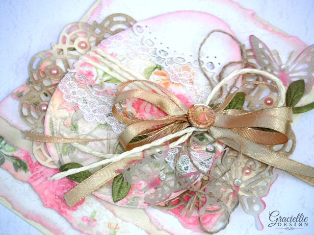 As you may notice the background of the card is made of ripped borders that I sponged with pink ink and layered together with wide lace. The pretty shabby chic egg started out with a free printable template you can find online for kid’s activities. I printed the template on patterned paper several times cutting borders on two of them to create layers for the egg… Easy! I embellished the card with lace, ribbon, jewels, a few decorative die cuts.