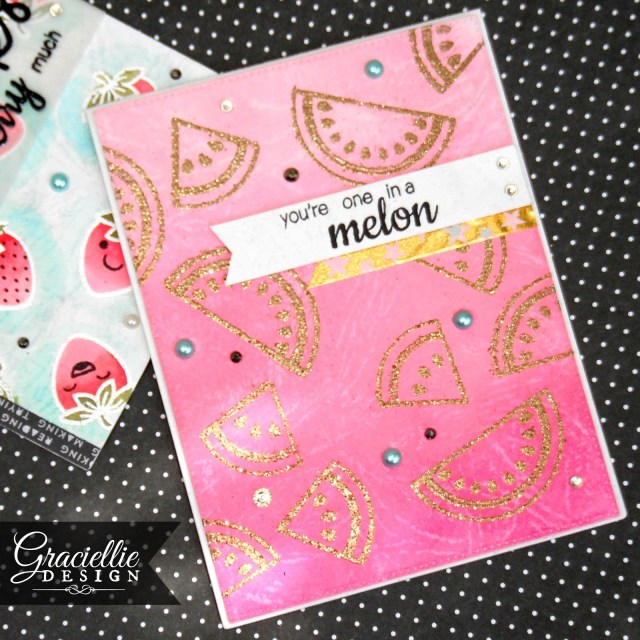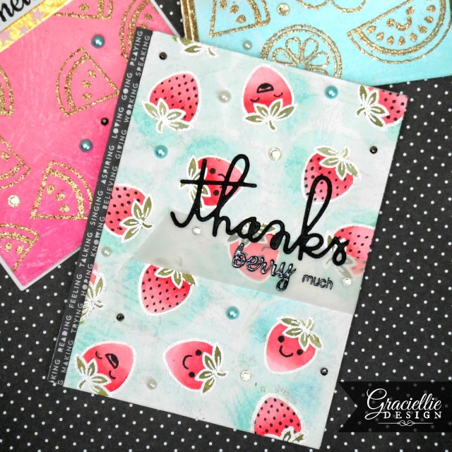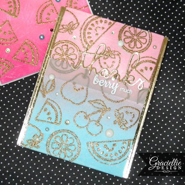 I created patterned backgrounds with the fun fruit images which I heat embossed in glitter gold and white. I went for an ombre look on 2 cards and I decided to watercolor the strawberries on my first card with distress inks. I also foiled the edges on my second card and discover the Thermoweb’s Champagne transfer foil matches perfectly the tone of gold on Clearsnap’s Glitter Gold embossing powder.