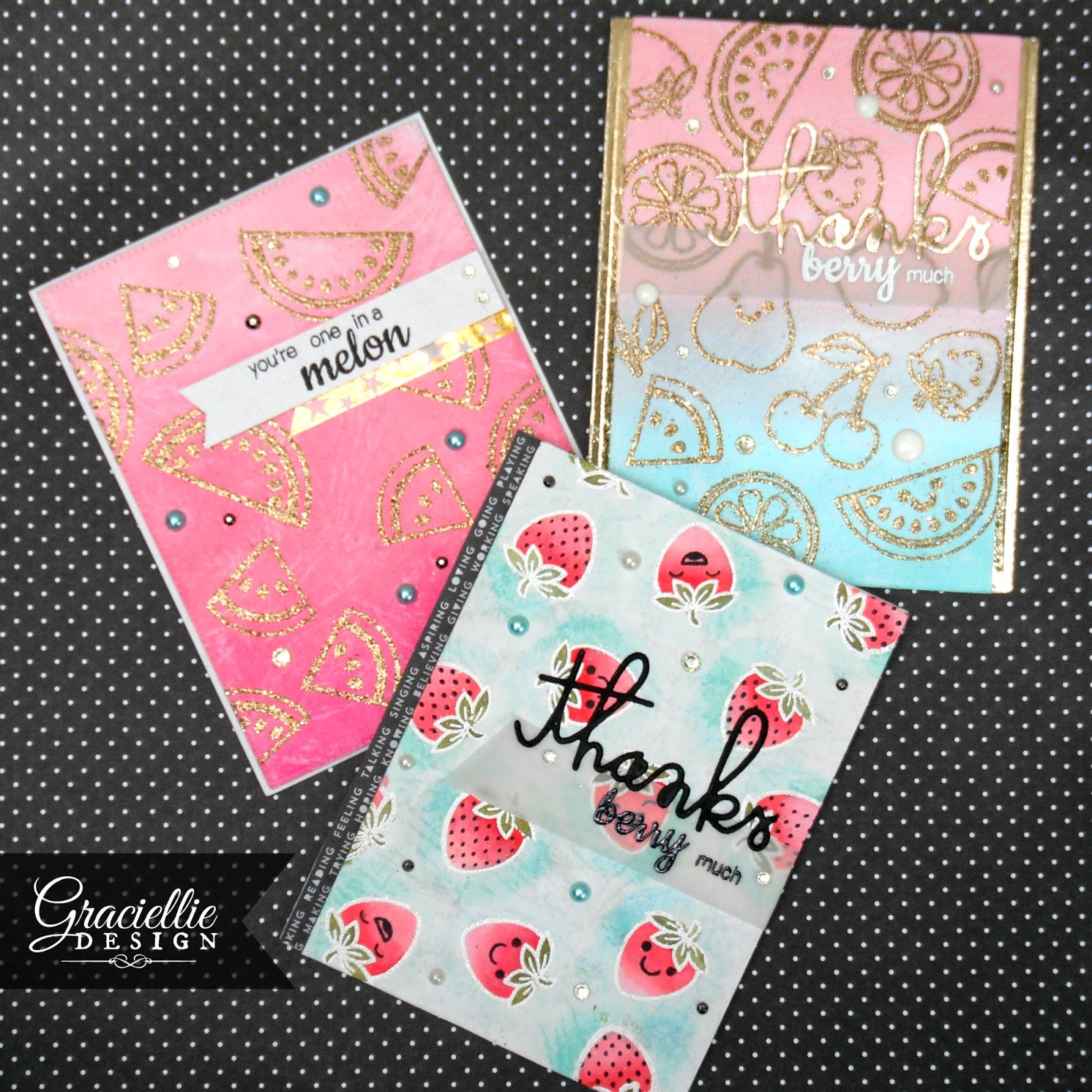 I created patterned backgrounds with the fun fruit images which I heat embossed in glitter gold and white. I went for an ombre look on 2 cards and I decided to watercolor the strawberries on my first card with distress inks. I also foiled the edges on my second card and discover the Thermoweb’s Champagne transfer foil matches perfectly the tone of gold on Clearsnap’s Glitter Gold embossing powder.