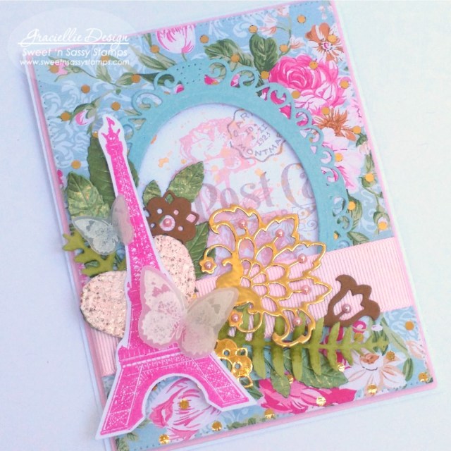 This pretty stamp set gives you so many possibilities. I created a subtle collage on the background and framed it with die cuts I arranged around the oval frame with a stamped Eiffel Tower from the same set.