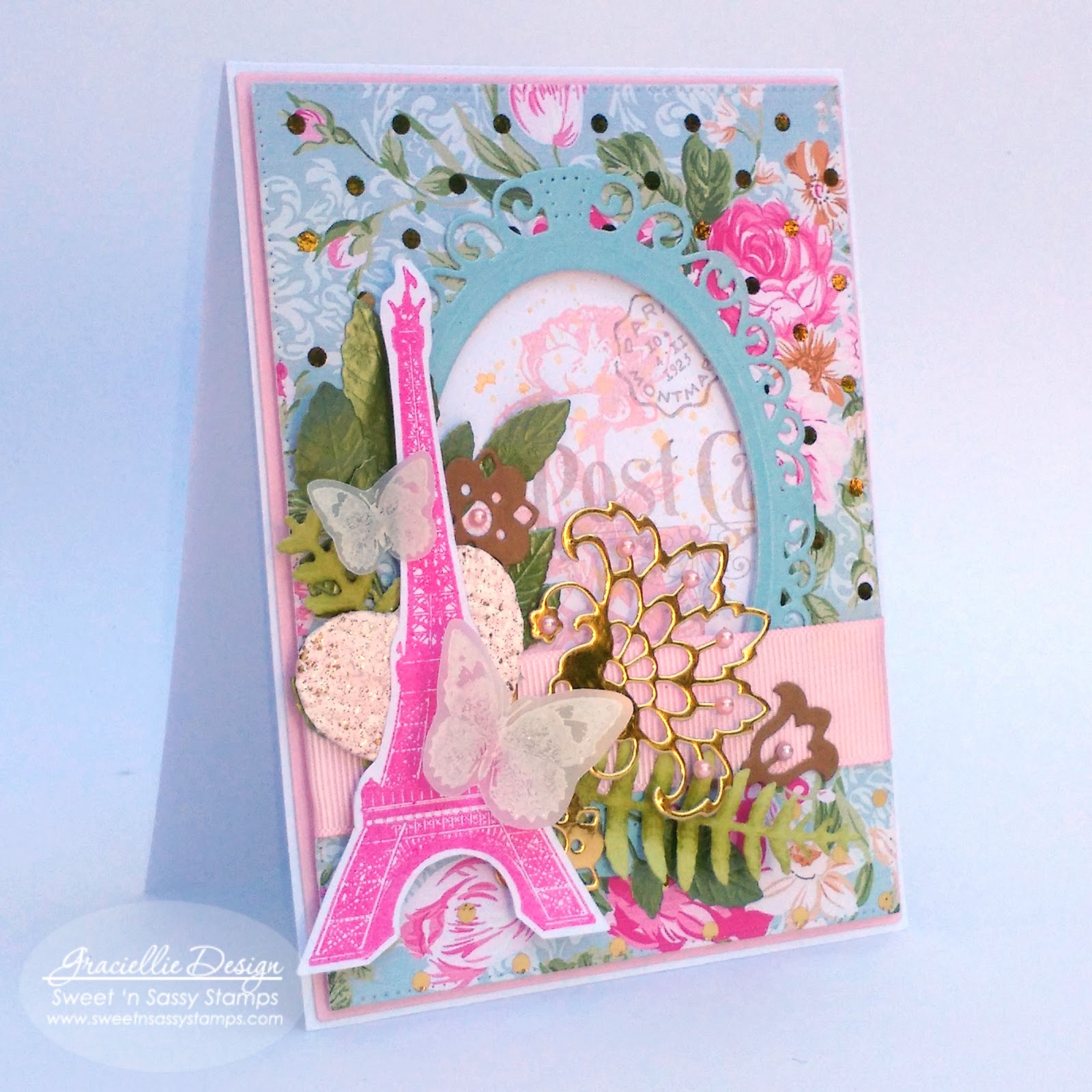 This pretty stamp set gives you so many possibilities. I created a subtle collage on the background and framed it with die cuts I arranged around the oval frame with a stamped Eiffel Tower from the same set.