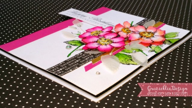 My card for today is very clean with a striking color palette. I wanted the flowers to stand out more than anything else. I colored them -guiding myself by dog roses pictures- in two tones of pink and decoupaged them to add more dimension.