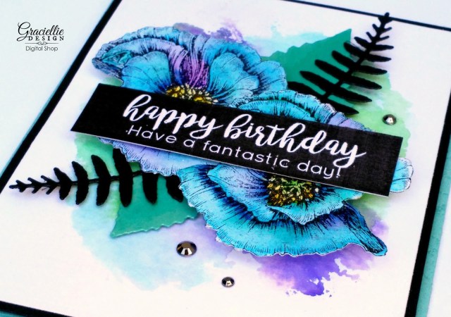 All that yummy sparkle on the flowers was added with shimmer spray, but you could also use glitter glue or glitter pens. The sparkle on the papers is actually original to some amazing metallic cardstocks (Juniper Berry Glimmer and Onyx Mica/Metallic) from an online shop I love: Paper Temptress. This card is just a little taste of what’s coming on March 15th, as we will have a blog hop with Paper Temptress’ designers to showcase our stamps together with their beautiful cardstocks!