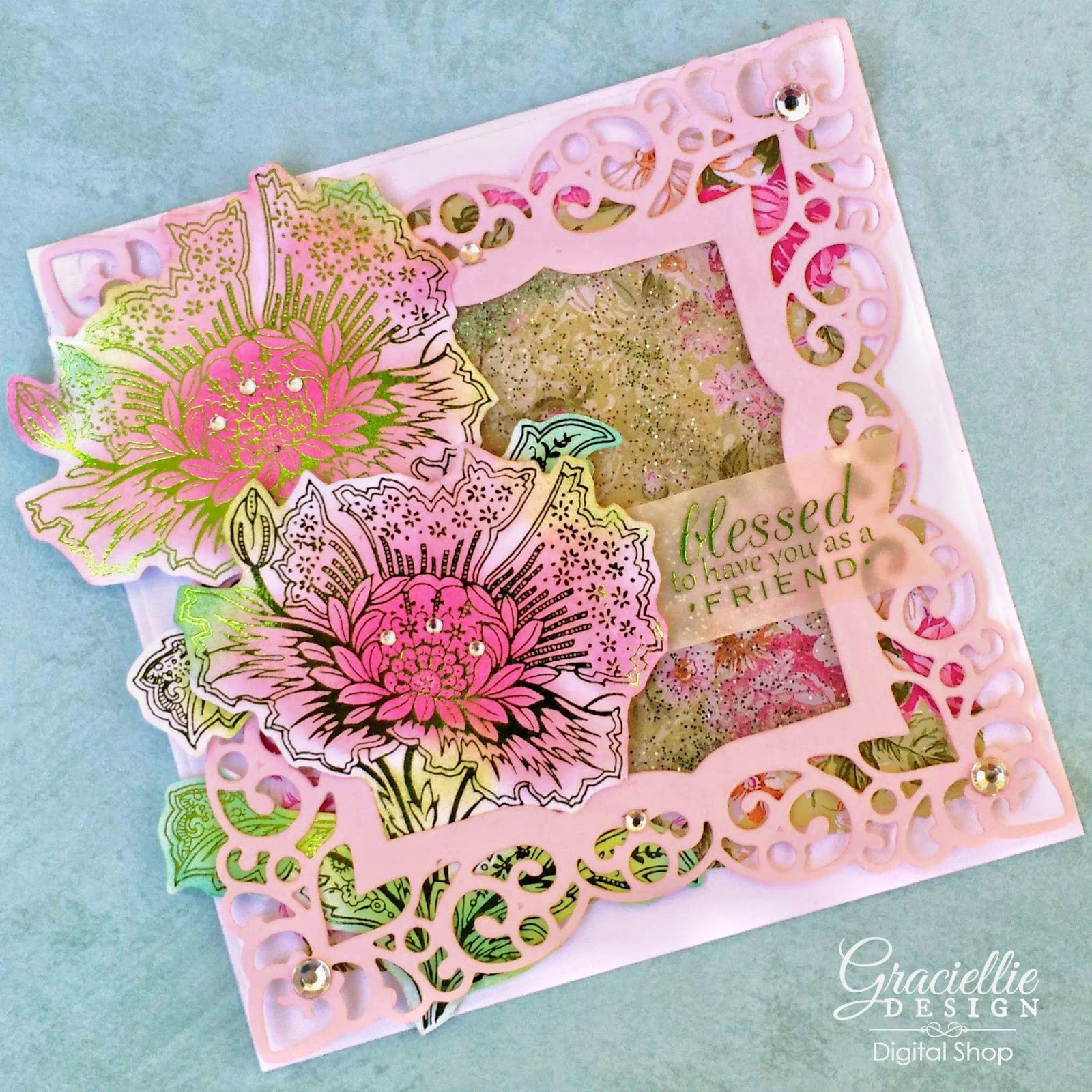 I’ve been playing a lot with foil resist techniques using different mediums. This time I colored these lovely Lace Flowers with pigment inks, blending different colors to achieve a soft and pretty look.