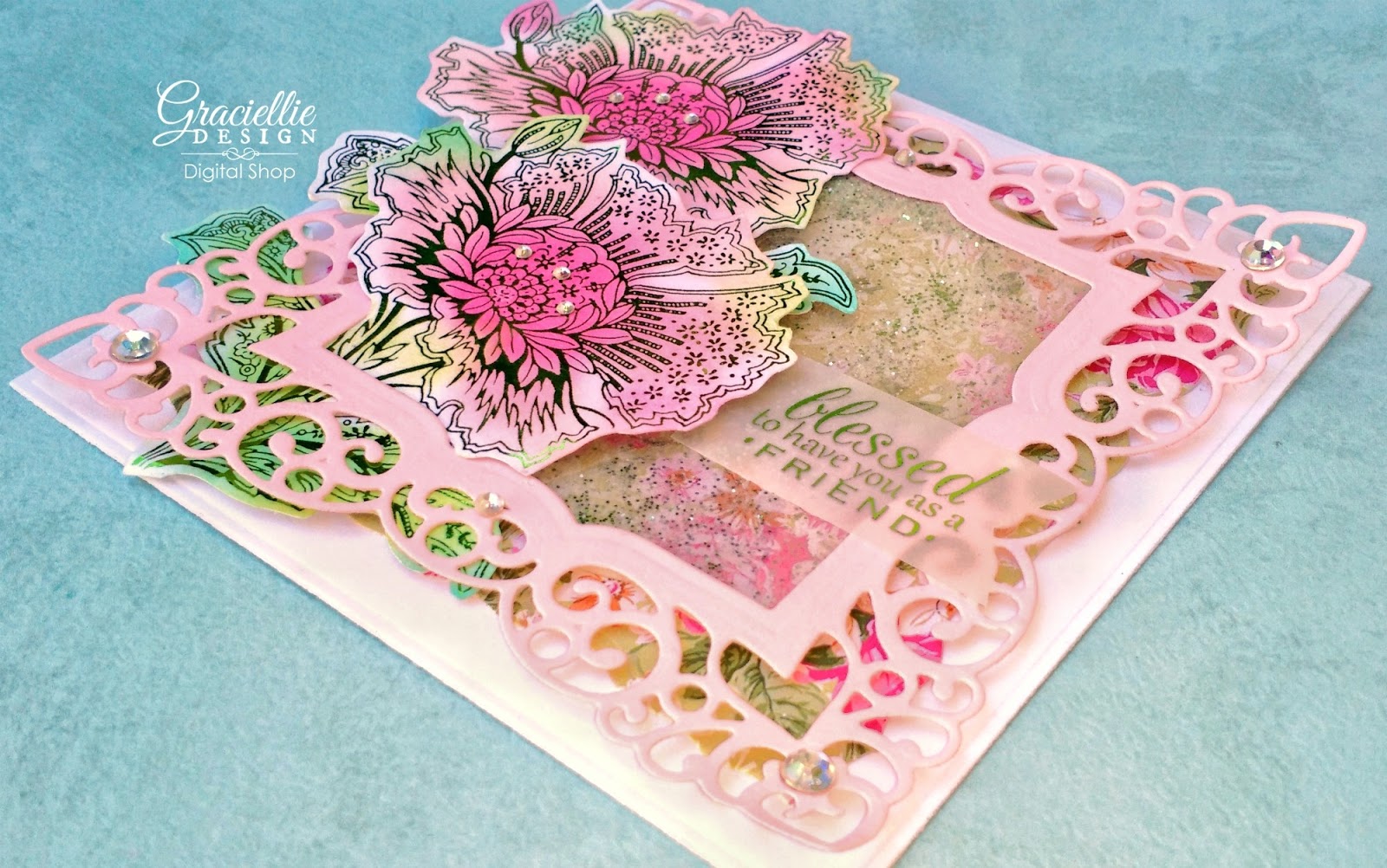 This card is also a shaker card, so it was fun to make too! To have it be a flatter shaker I used glitter. To finish the card I added a foiled sentiment on vellum and a few rhinestones. The final effect of this card is truly soft and very Spring forward!