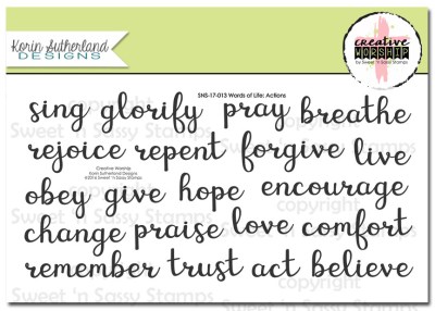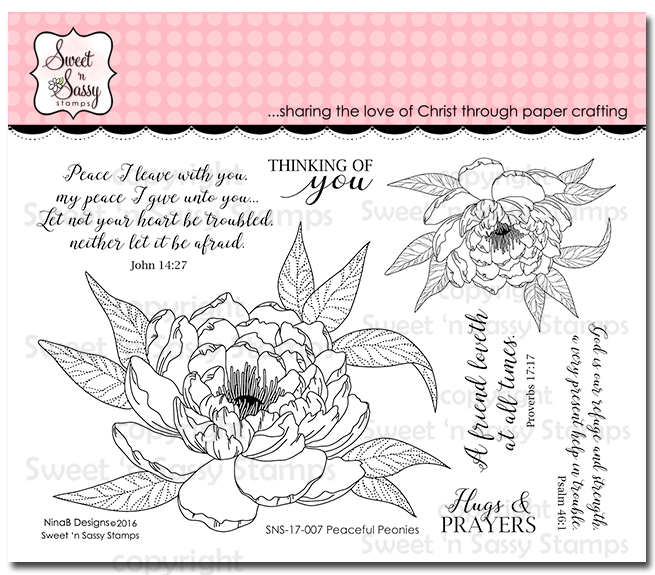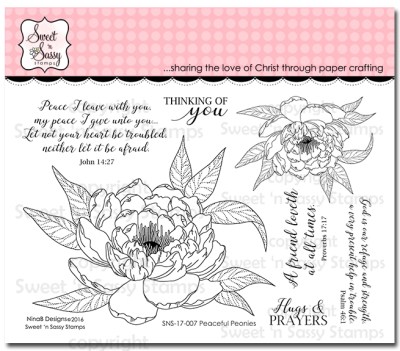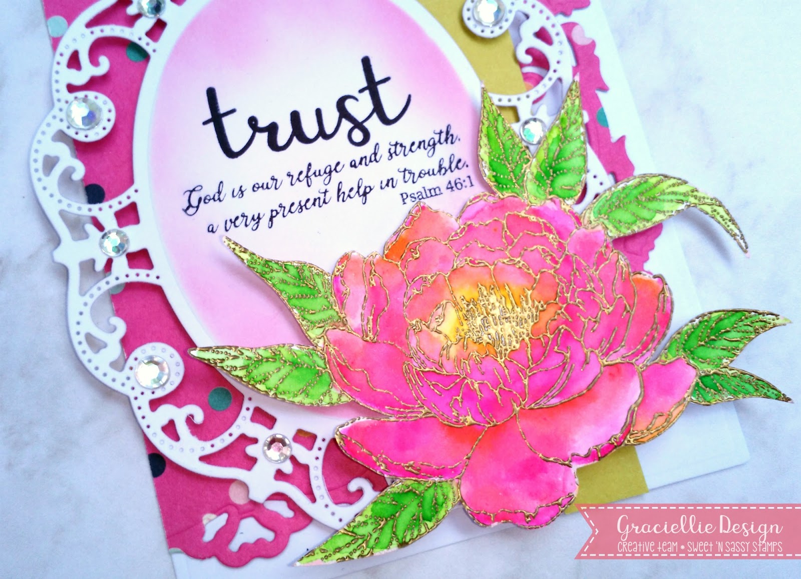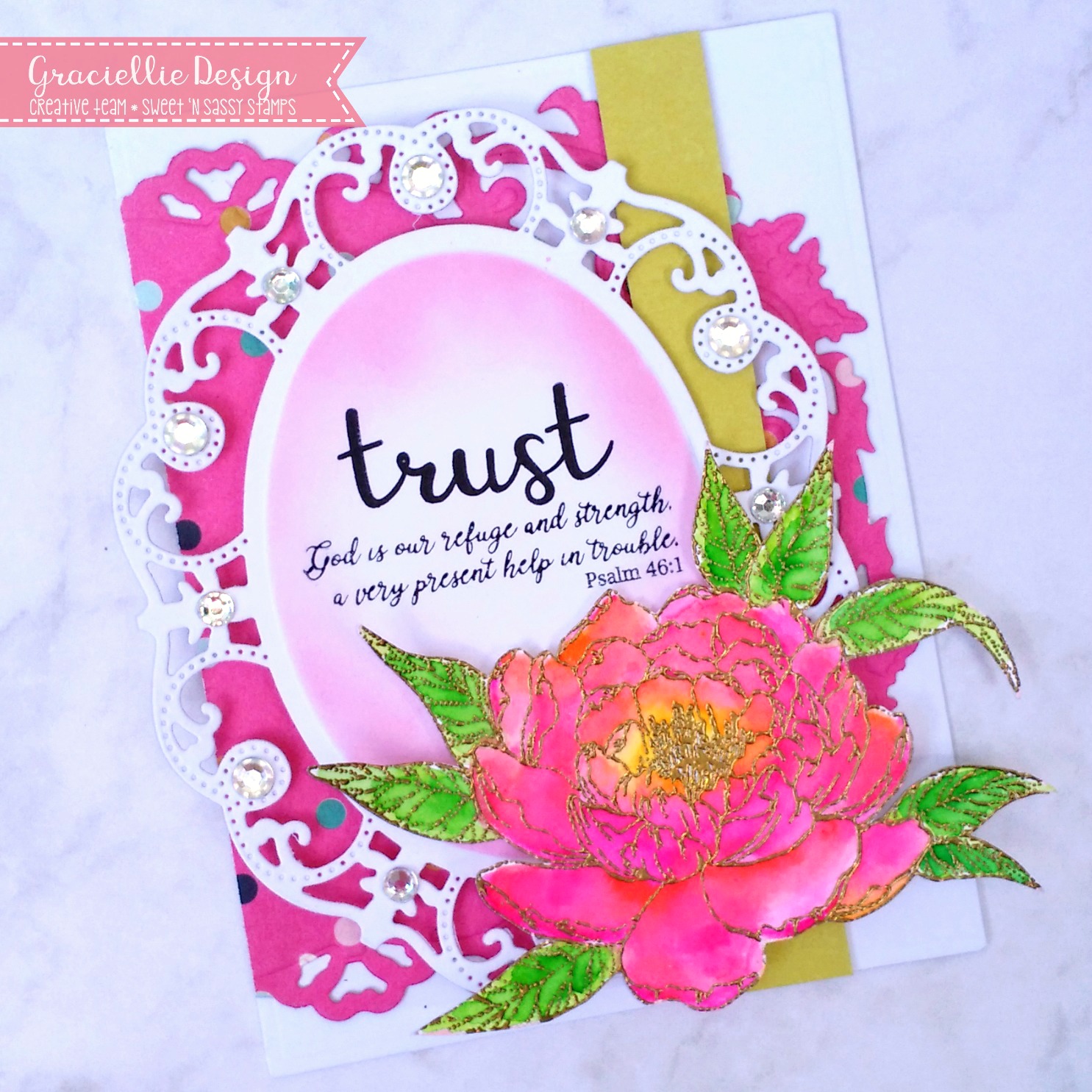 The encouraging word and verse are perfect for the card front. I used one of the words from Words of Life as the focal sentiment and then I stamped right under it a verse from Peaceful Peonies.I framed the inspiring sentiment with decorative die cuts and a heat embossed peony I colored with watercolor markers.